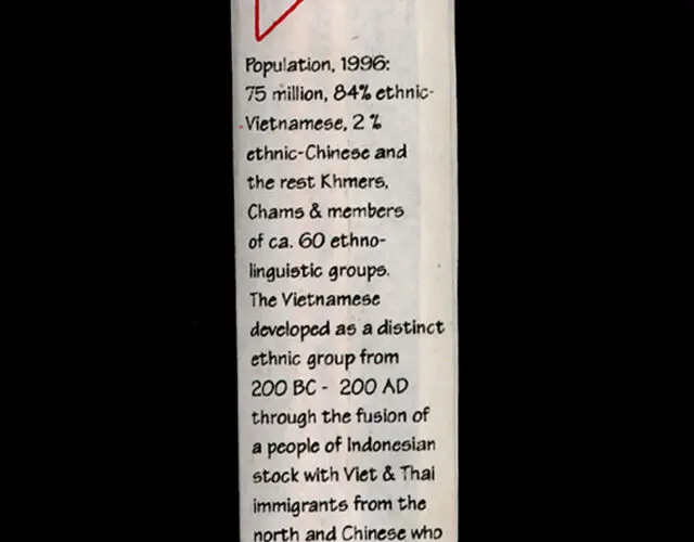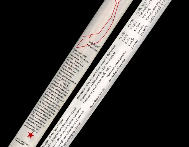 During my second visit to Vietnam, I was frustrated by my limited proficiency in the Vietnamese language, which I felt hindered my connection to my mother’s homeland. This experience led to the creation of the Long Live Tourism! Useful Souvenirs: Chopstick Bags, which playfully addresses the irony of consuming a foreign culture — such as its cuisine — without engaging with its language.